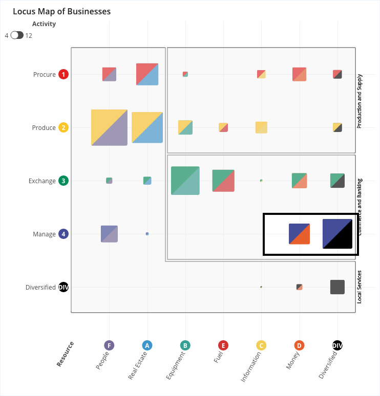 The Locus Model uses simple phrases to describe the products of economic agents -- we call this a locus. Just like English sentences, each locus is made up of a verb and an object; it’s as easy as saying “transports people” or “produces equipment”. The locus of an economic agent can also be thought as the functional location of that agent in the context of the larger economy. Locus Maps visualize loci by splitting the verb and object along the axes of a coordinate plane. As a result each box on the grid contains businesses that are functionally similar to each other.